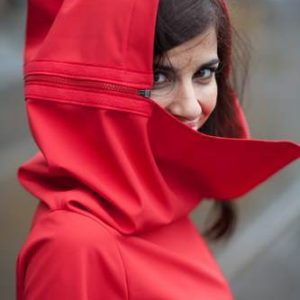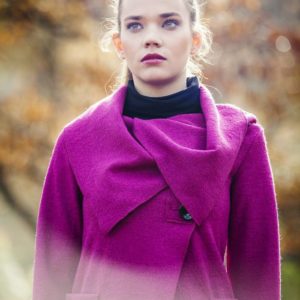 Ein großer Kragen um die Schultern zu betonen, ein symetrischer Verschluss um ihre Taille zu trimmen, große Taschen um den Kragen zu kompensieren. Die gewünschte Harmonie wird durch die Kombinaition der verschiedenen Größen des Kragens und der Taschen erreicht.
