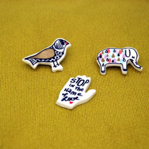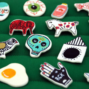Mit ihren bunten Ansteckern aus Polymer Clay möchte sie ihre Illustrationen tragbar machen. Es gibt herzige Tiere, Alltagsobjekte oder auch Gurken mit Gesicht. Die Auswahl ist groß, aber Achtung! Manche Stücke gibt es nur einmal. Jeder Anstecker wird liebevoll handgefertigt. Ein absoluter Blickfang auf jedem Outfit.