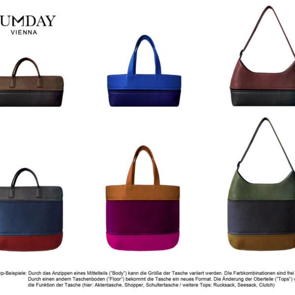 SUMDAY Vienna bietet nicht weniger als die perfekte Tasche. Schnell und leicht kann man die aus hochwertigem italienischem Leder und leichtem, wasserundurchlässigem Neopren hergestellten Teile selbst zusammenstellen und so Design, Größe, Funktion und Ausstattung individuell anpassen. Je nach persönlichem Anspruch und aktuellen Trend kann die Tasche jederzeit verändert werden. Da wird der blaue Taschenboden einfach rot, wenn er so besser zum neuen Mantel passt und die Aktentasche mit einer Handbewegung zum Rucksack, wenn man die Hände frei braucht. Durch ein einfaches Reißverschluss System passt sich die Tasche mühelos und unkompliziert an jeder Lebenssituation an. So schaffen es die Kollektionen von SUMDAY Vienna die Ansprüche an ein langlebiges Produkt mit den neuesten Trendentwicklungen der Mode zu vereinen. SUMDAY Vienna macht Spaß und Sinn!